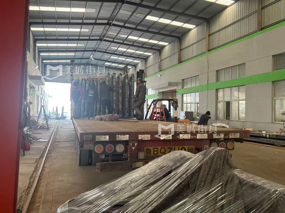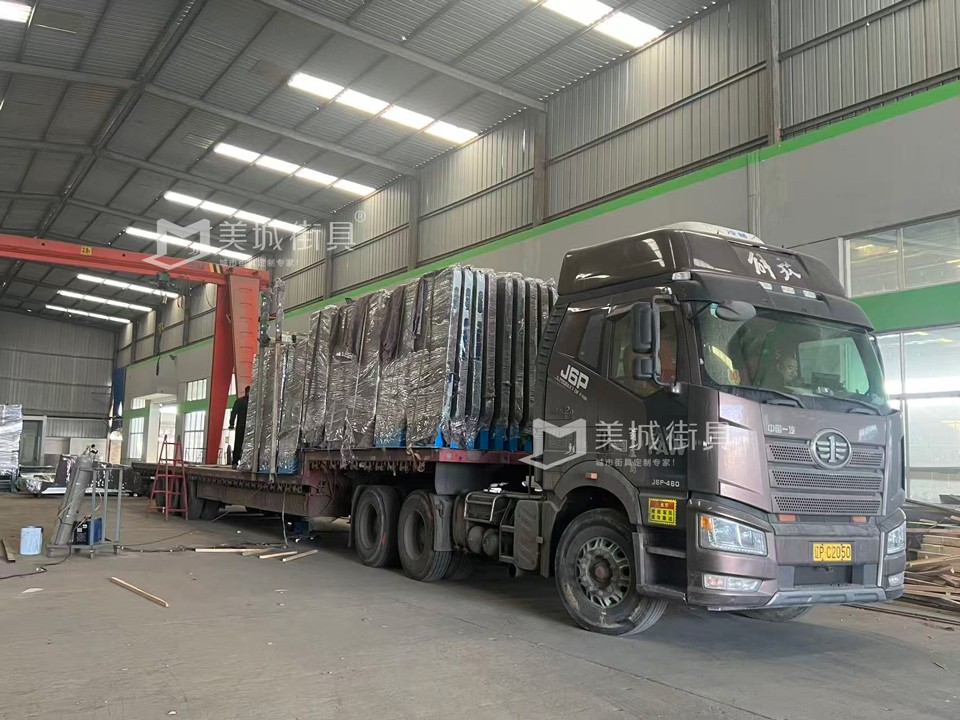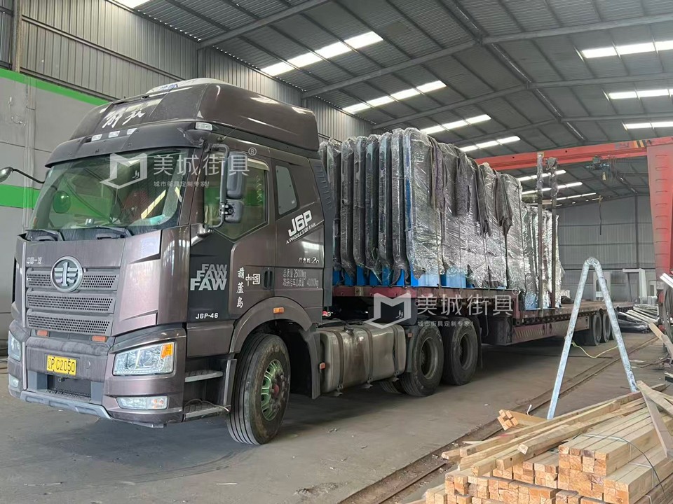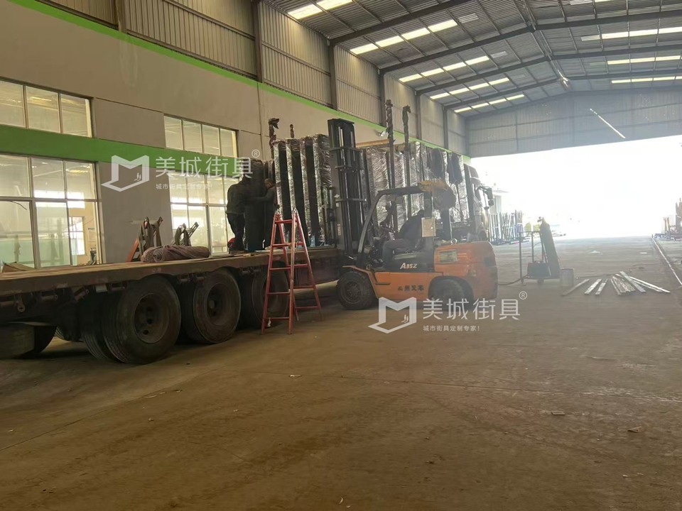 江蘇美城街具供應(yīng)葫蘆島第四批公交候車亭發(fā)貨案例,以下是候車亭站臺發(fā)貨現(xiàn)場圖: